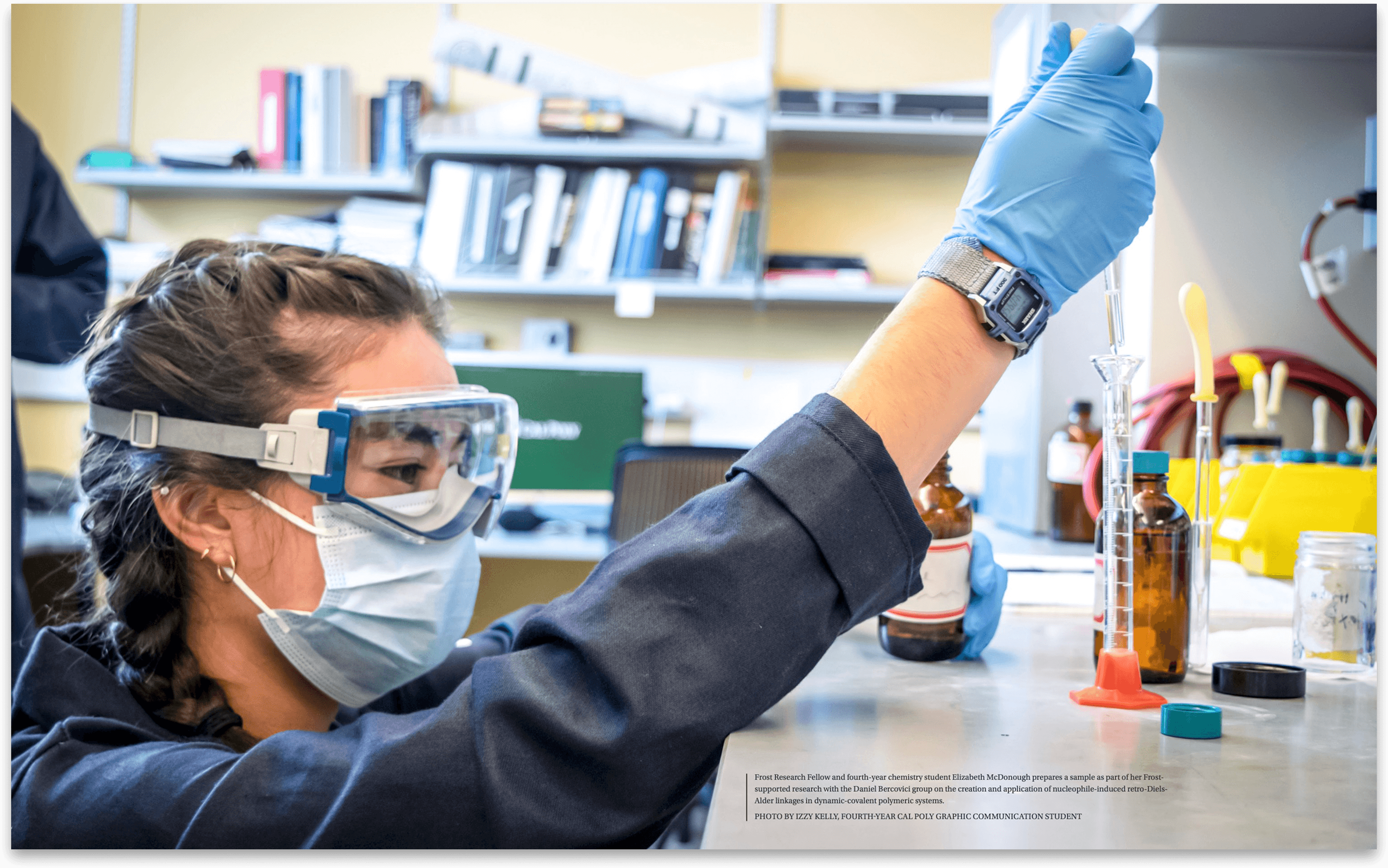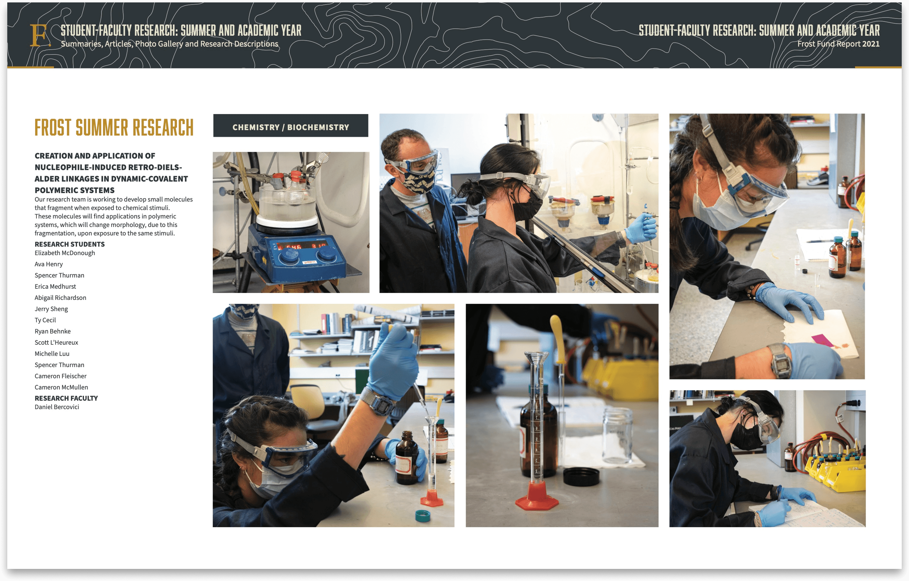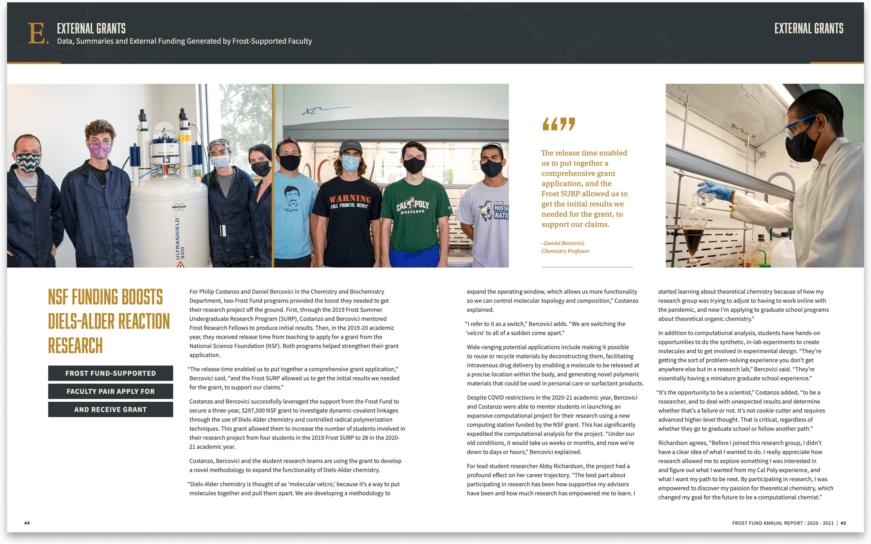 The Cal Poly Frost report is an annual report produced and printed for Bill and Linda Frost, alumni of Cal Poly who donated $118 Million to the College of Science and Math. The report includes how their money is being used throughout the program, including photos and stats of student/faculty research groups.