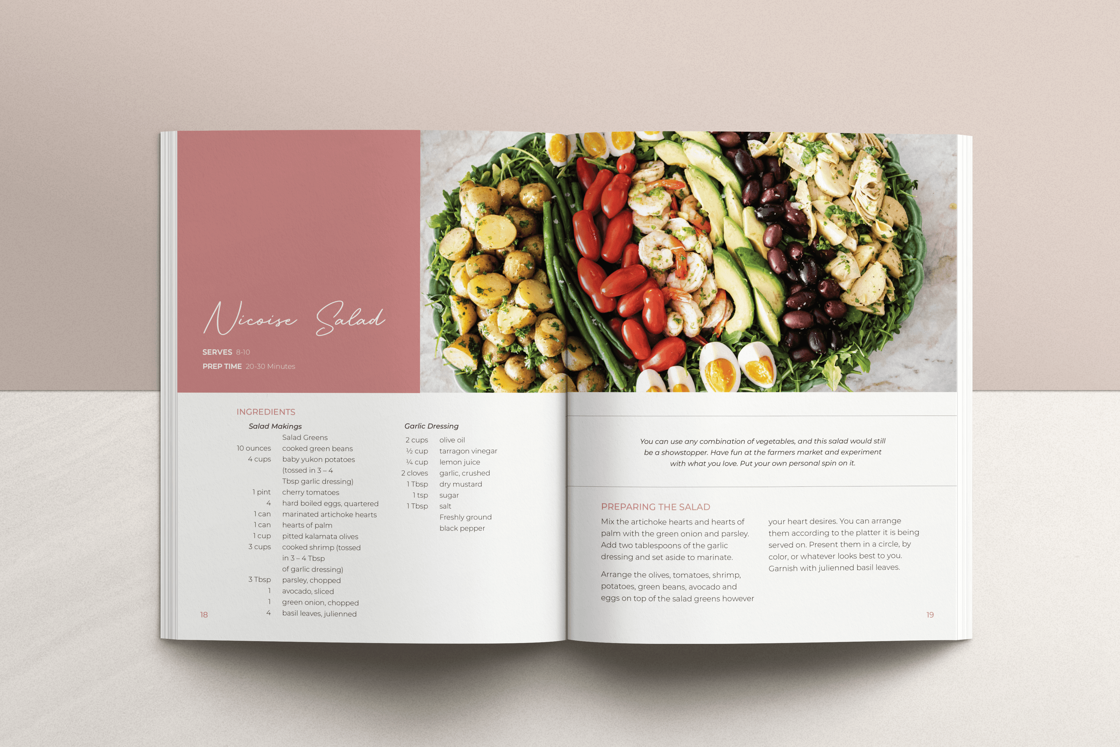 In order to do this, the book needed incredible consistency. I made sure that each recipe followed the same styles from listing ingredients, to chef notes, to instructions. I used InDesign paragraph/character styles throughout the cookbook to ensure continuity between each page. Each page followed the same layout and spacing using an 8 column grid.