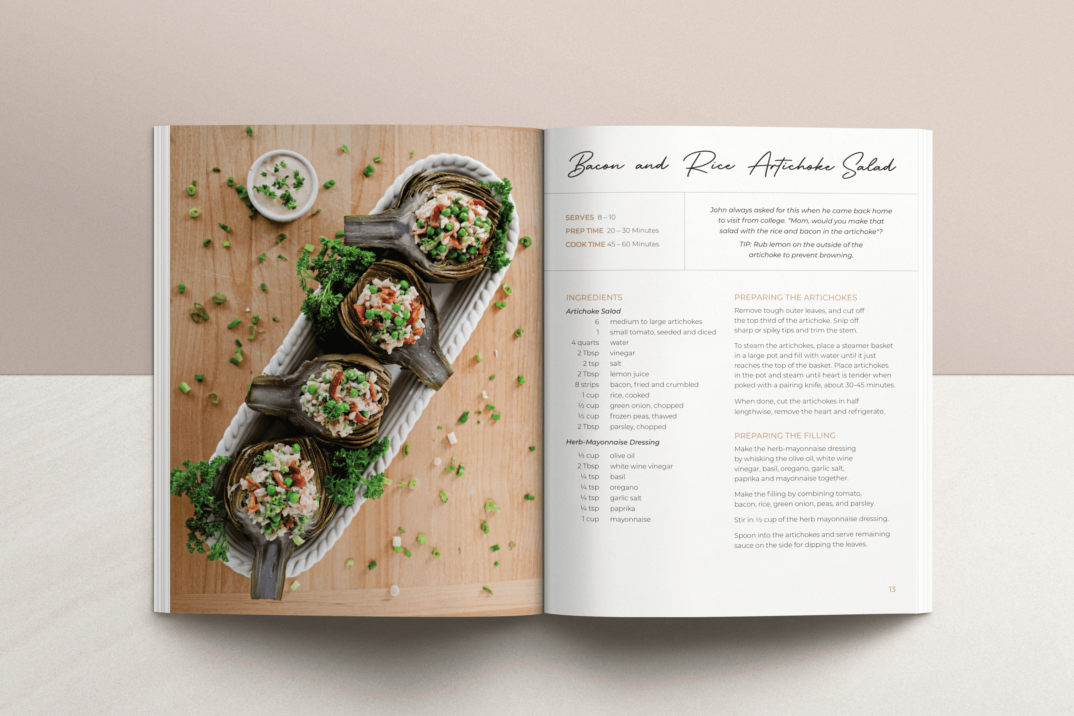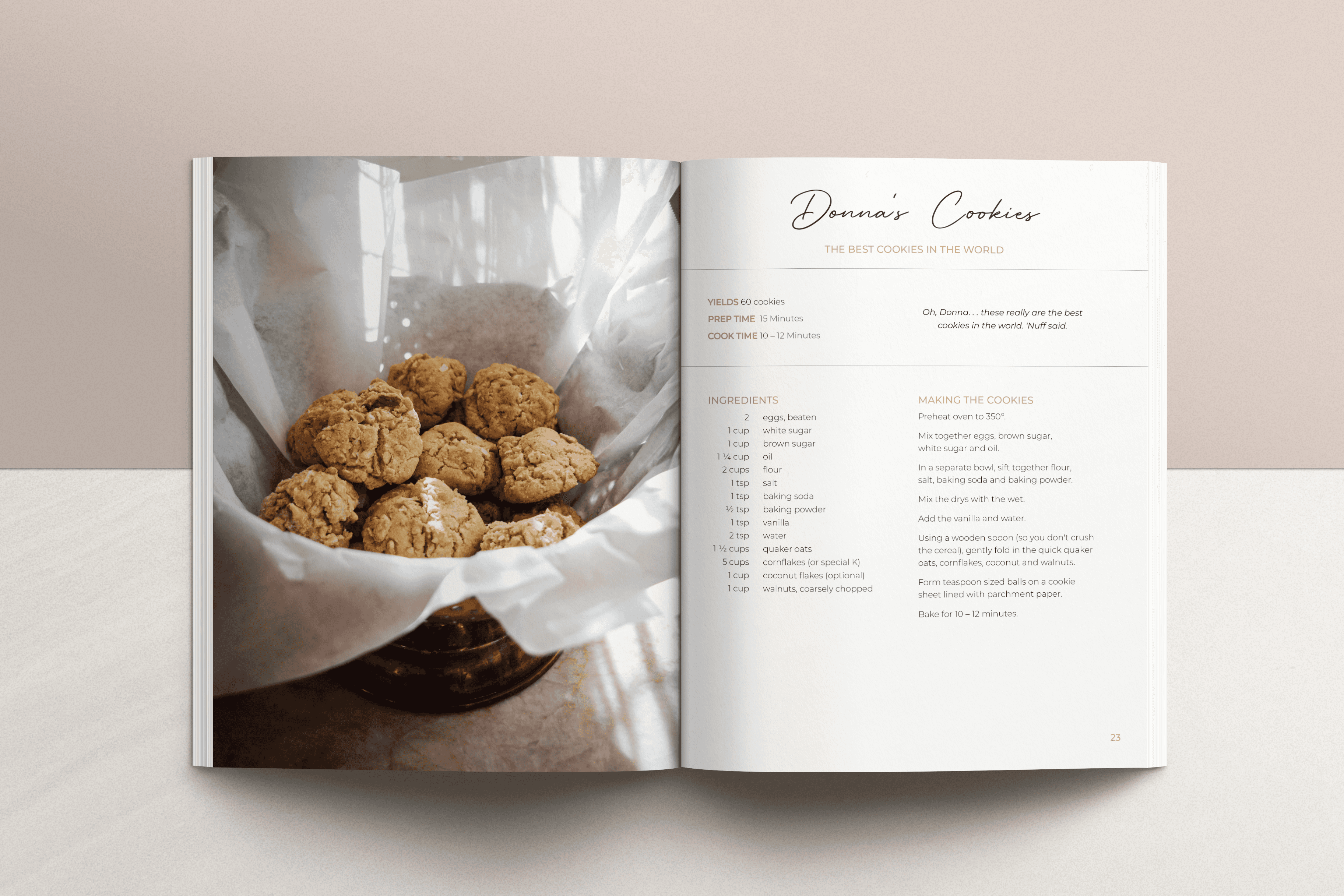 Before anything, I needed to define a brand for this book. Within the first two weeks, I locked in the header and body fonts and color palette. The meat of this project was the cooking and the photographing. I needed these recipes to come to life, and with the help of my grandmother I was able to do so. She and I cooked all of these recipes and shot them myself in her kitchen. I shot these images on a Nikon D7500 and edited them all in Lightroom.